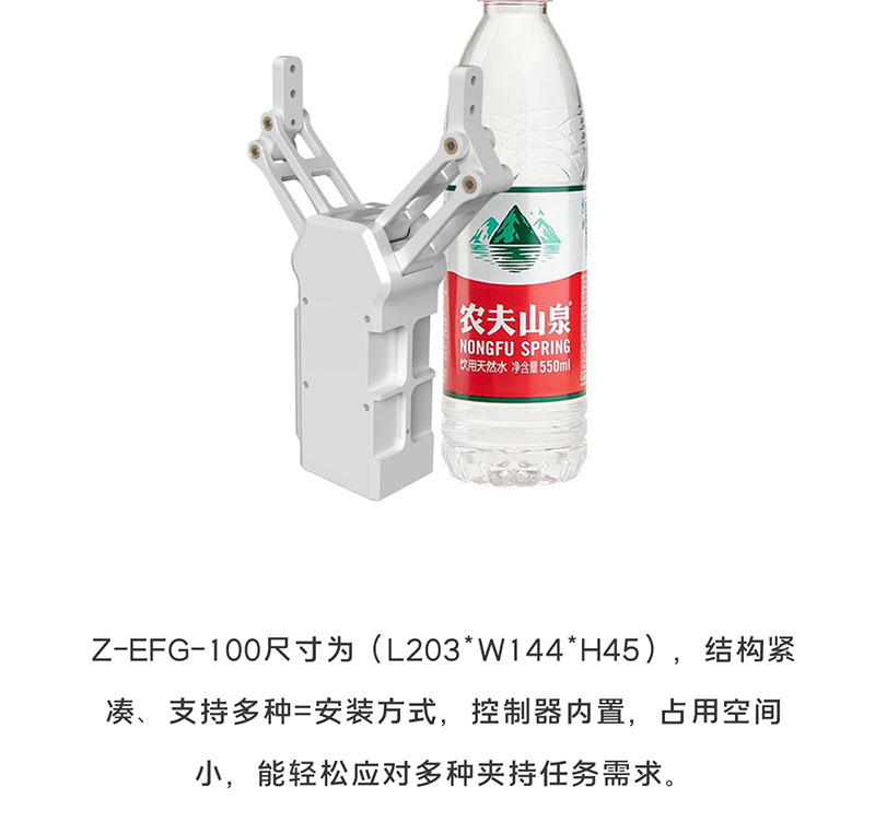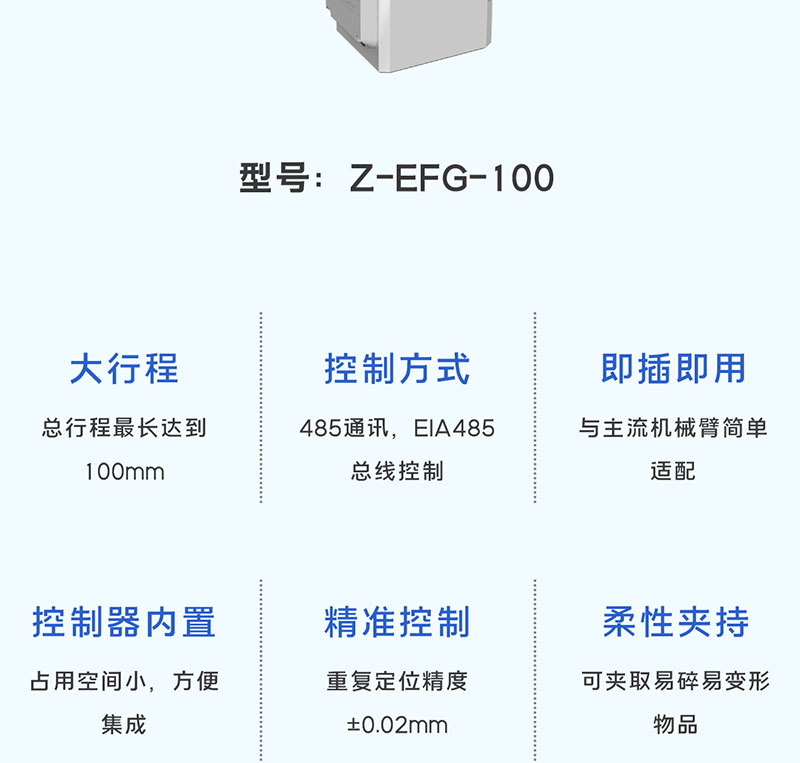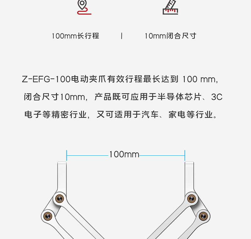 ? ? ? ? 慧靈HITBOT,電動夾爪Z-EFG-100,擁有100mm的長行程,夾持力&行程可調(diào),控制器內(nèi)置,即插即用,有自適應抓取,功能強大!