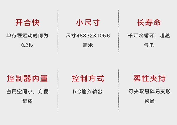 Z-EFG-12電動夾爪是慧靈科技HITBOT應對高頻快速抓取場景,而推出的微型電磁夾爪,基于分體式的設計達到極限緊湊的體積,配置簡單,可適用于狹小環境。產品體積緊湊,夾爪機體長寬為 48×32mm,單行程時間僅為0.2秒,一秒鐘內便可完成多次開合動作,適應快速抓取的需求,可部署于較為狹小的環境。