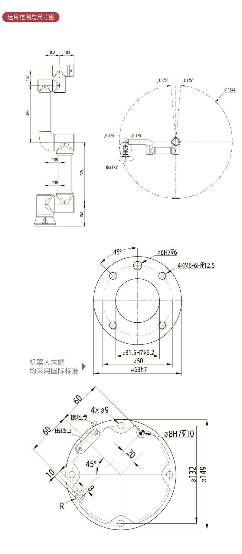 4軸:+85°,-265°;? 5軸:±175°;? 6軸:±175°