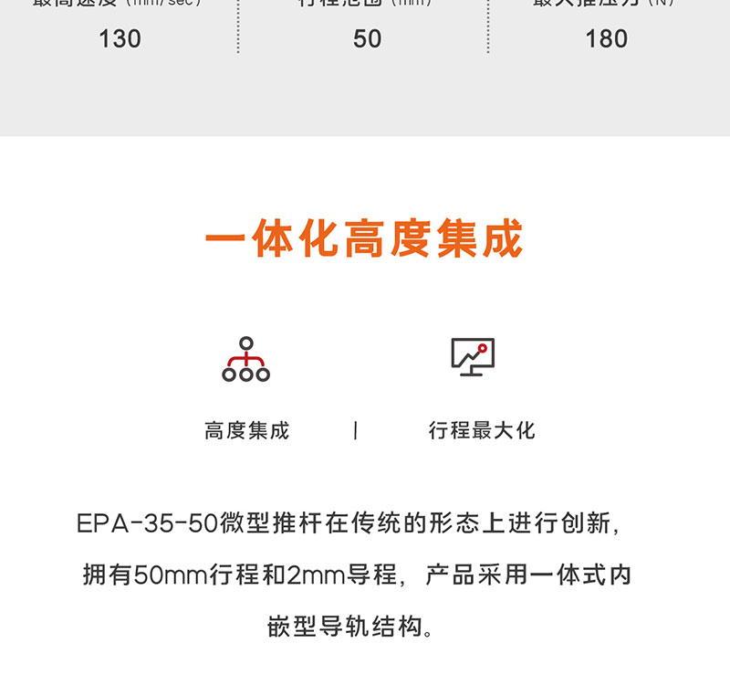 2023年1月7日 Lu, DongWu 智能電缸 0 Z-Mod-EPA-35-50 首頁 / 智能電缸 / Z-Mod-EPA-35-50 微型電動推桿 滑塊結構,抗傾覆力強 點擊觀看視頻 微型電動推桿 滑塊結構,抗傾覆力強 點擊觀看視頻 產品描述 型號參數 資料下載 產品描述 Z-Mod-EPA-35-50 核心參數 2mm 300N? 導程 最大推壓力 50mm ? ? ? ? ? ? ? ? ?3KG 行程 ? ? ? ? ? ? ? ? ? ? ? ? ? ? ? 重復定位精度 *線框尺寸圖 型號參數 說明項 參數 行程(mm) 50mm 50mm 導程(mm) 1mm 2mm 最大速度(mm/s) 65mm/s 130mm/s 最大推壓力(N) 300N 180N 最大負載質量(kg) 水平:6kg/垂直:2kg 水平:3kg/垂直1kg 重復定位精度(mm) ±0.02mm ±0.02mm 力控精度 ±10% ±10% 推桿不旋轉精度 ±1.5° ±1.5° 負載允許力矩 MR:3.14NM MP:1.42NM MY:1.42NM MR:3.14NM MP:1.42NM MY:1.42NM 整機重量 0.6kg 0.6kg 尺寸規格 125*48*35mm 125*48*35mm 控制方式 I/O控制、485總線控制 適用控制器 Z-Mod-DCIC-4 工作電壓 DC24V±10% 額定電流 2.3A 峰值電流 6.9A 使用環境 IP40 防護等級 0-40℃,85%RH以下(無結霜) 資料下載 點擊下載產品手冊 點擊下載3D圖 點擊下載運動范圍圖 產品詳情 相關產品