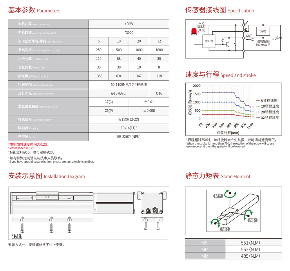 行程范圍 Range of travel(mm) 50-1100MM/50行程遞增